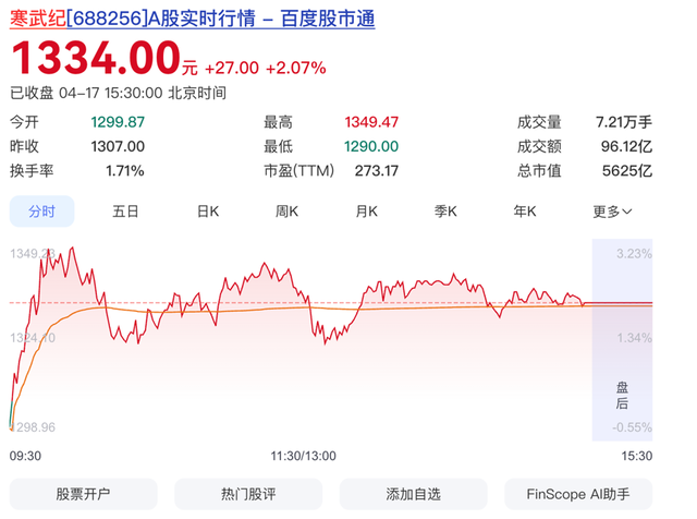 截至4月17日收盘,寒武纪股价为1334元/股。