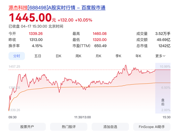 A股市场迎来历史性一刻。4月17日,光芯片龙头源杰科技盘中强势拉升,截至收盘,源杰科技报1445元/股,单日涨幅达到10.05%,而贵州茅台报1407.24元/股。源杰科技股价超越贵州茅台,成为A股新“股王”。